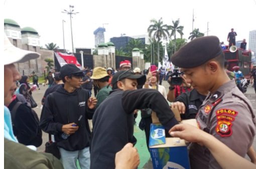 Pembagian air mineral dan roti ini menjadi bagian dari upaya Polri dalam memberikan pelayanan humanis kepada masyarakat yang sedang menyampaikan aspirasi.